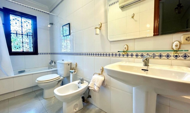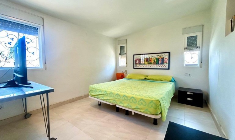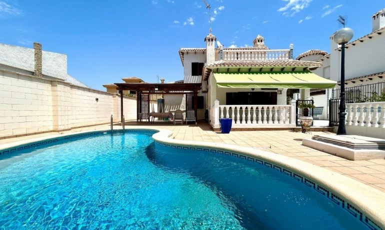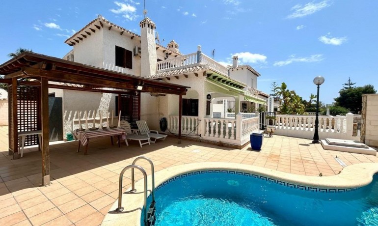 Detached chalet located in one of the most popular areas of Orihuela Costa, La Zenia, just 400m from the beach. Built on a 453m2 plot, the two-story home has approximately 150m2 of living space. On the ground floor, we find a spacious and bright living-dining room with a fireplace, a semi-independent kitchen, two double bedrooms, one bathroom, and a laundry room. There is a spacious front porch. On the first floor, there are two more bedrooms and another bathroom. From the master bedroom, there is access to the approximately 20m2 terrace. The home faces south. It has a 28m2 private saltwater pool. The basement includes a closed garage. Sold furnished. Close to all necessary services, a wide variety of bars and restaurants, it is an ideal location for year-round living or a wonderful holiday. La Zenia Beach is less than a 10-minute walk away. La Zenia Boulevard Shopping Center is a 5-minute drive away.