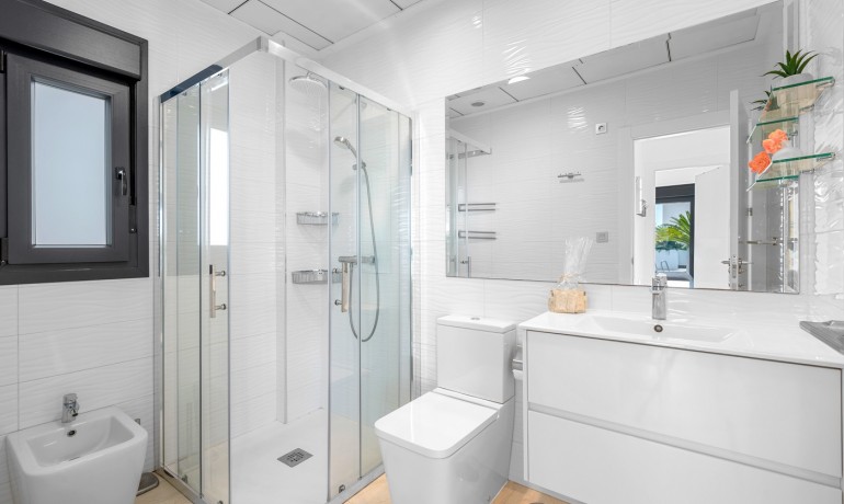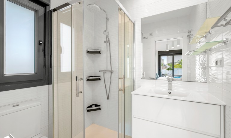 This modern detached villa, built in 2018, is located in Villamartín, Orihuela Costa. With a built area of 113 m² on a generous 464 m² plot, the property offers a contemporary design and a functional layout perfect for enjoying the Mediterranean lifestyle. Its south-facing orientation ensures natural light throughout the day, creating a warm and inviting atmosphere. The villa features three spacious bedrooms, all with built-in wardrobes, and two full bathrooms, one of them en suite. The open-plan kitchen seamlessly connects to the dining and living areas, which are bright and welcoming, with direct access to the terrace and private pool. A separate laundry room adds extra convenience. The outdoor area boasts a private pool, easy-maintenance garden areas, a covered terrace ideal for outdoor dining, and a pergola-covered dining space with artificial grass. The large rooftop solarium offers additional relaxation space. The property also includes on-site parking with a covered carport. Extras include ducted air conditioning, solar panels, high-quality finishes, and a well-designed layout. Located in a peaceful residential area, the home is close to golf courses, shopping centers like Zenia Boulevard, and the best beaches of Orihuela Costa. This villa is a perfect choice both for permanent living and for a secure investment in one of the most desirable areas of the Costa Blanca.