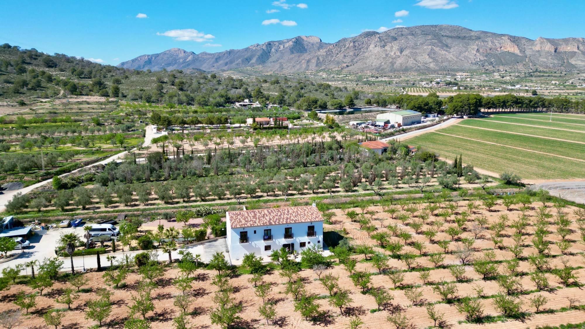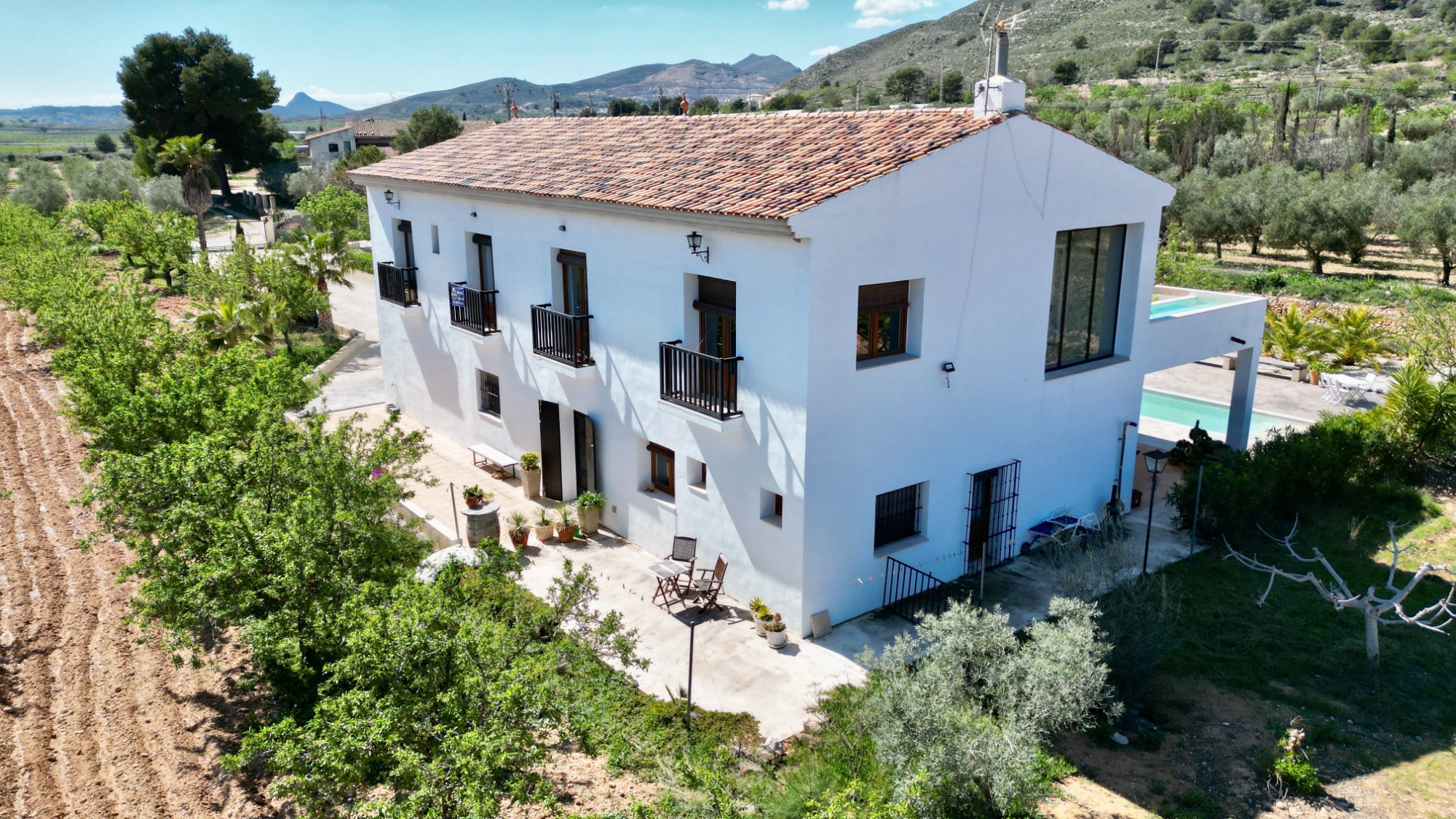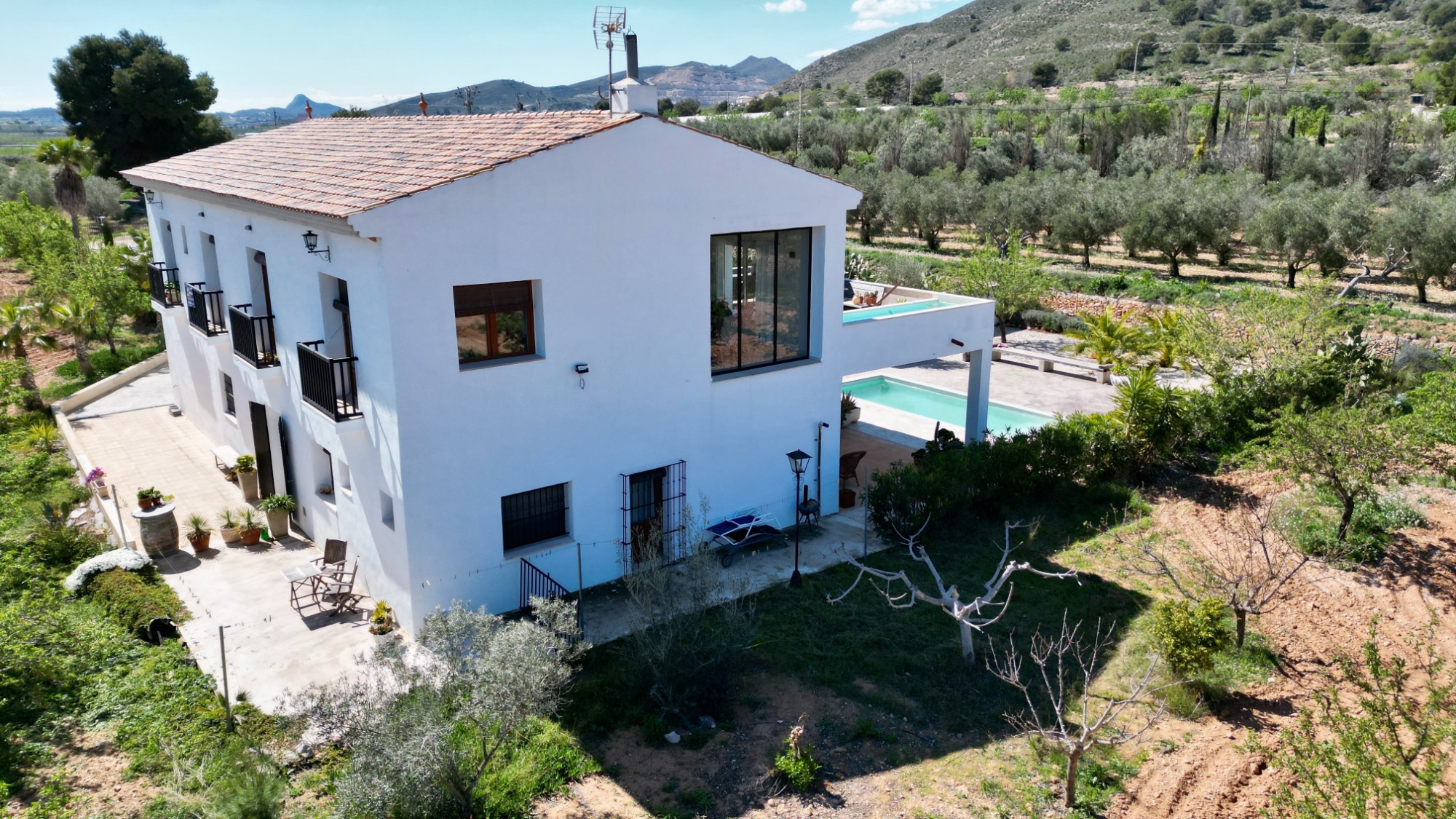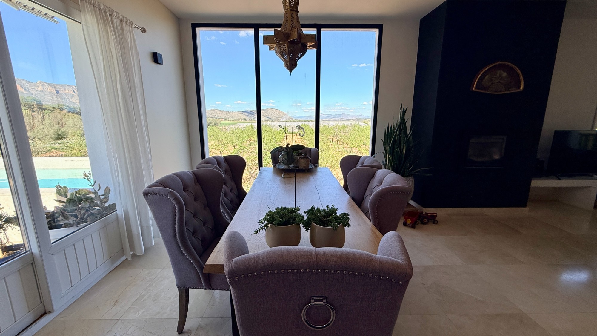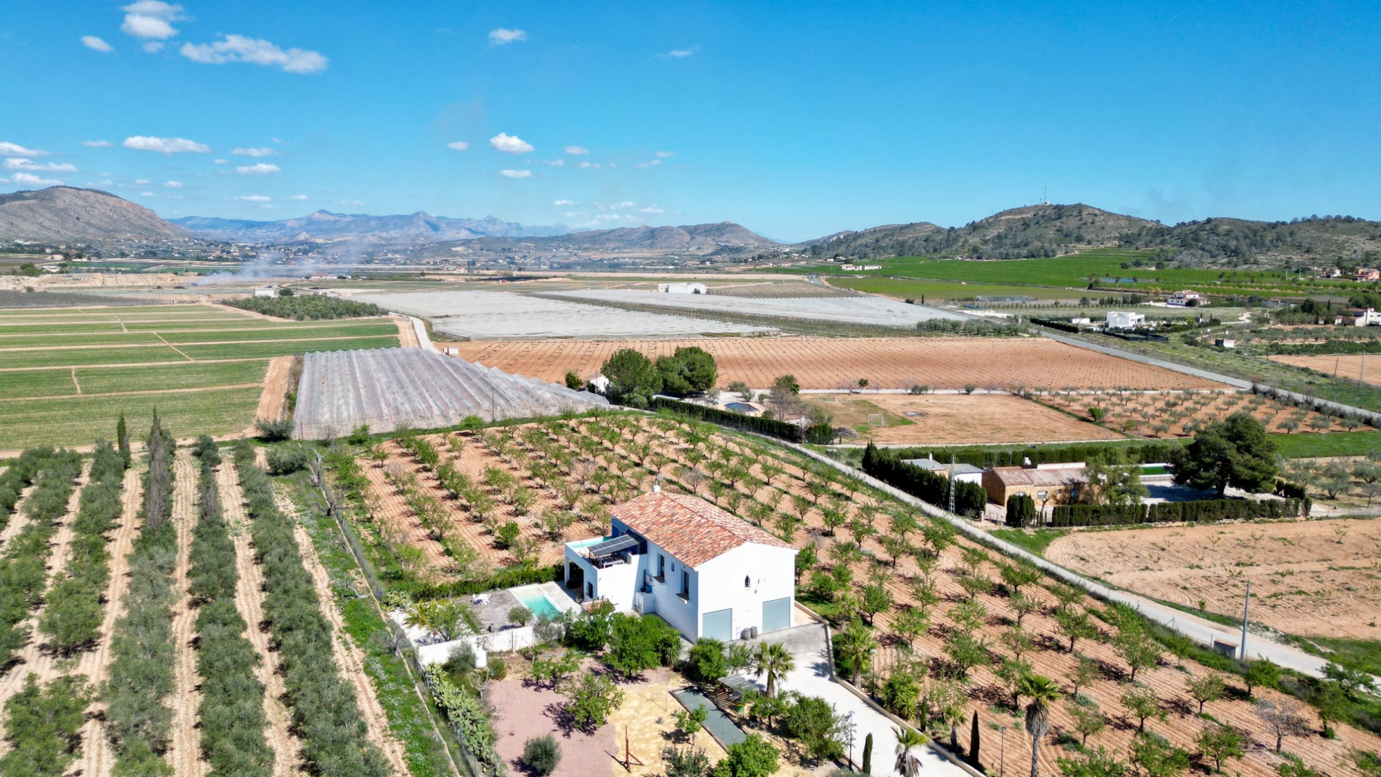 Set discreetly within its own 12,600m² private estate, surrounded by approximately 200 productive almond trees, this exceptional finca-style villa offers a rare fusion of traditional Mediterranean charm and contemporary design. Located between the charming villages of Hondón de las Nieves and Hondón de los Frailes, the property provides complete tranquillity while remaining just minutes from restaurants, cafés and local amenities. From the moment you arrive through the remote-controlled sliding entrance gate, the sense of space and exclusivity is immediately clear. A palm-lined driveway leads through the grounds towards the villa, with ample guest parking and two garages accommodating up to three vehicles. This is a property designed for those who appreciate both elegant architecture and effortless entertaining. The Main Villa – Elevated Living with Panoramic Views The principal living accommodation is located on the first floor, designed to maximise the spectacular views across your own almond grove and the surrounding Hondón Valley. Entering through the foyer, you are welcomed into a central hallway leading to a magnificent open-plan living and dining space. Large feature windows flood the room with natural light while framing the landscape beyond. The living area flows seamlessly into a bespoke designer kitchen, finished in luxurious dark tones with generous work surfaces, high-quality appliances and extensive storage – ideal for both everyday living and entertaining guests. Step outside onto the expansive first-floor terrace, where the lifestyle this home offers truly comes to life. Here you will find: • A private 5m balcony swimming pool• Outdoor dining area• BBQ and entertaining space• Sunbathing terrace with panoramic valley views Imagine cooling off in the pool while overlooking your own almond grove, or enjoying long Mediterranean evenings dining under the stars. Bedrooms Designed for Comfort and Style The main floor offers three spacious double bedrooms. The master suite provides a luxurious retreat, featuring: • Double vanity unit• Walk-in shower• Bathtub• Elegant contemporary finishes Two further double bedrooms of which one is en-suite share a beautifully designed shower room, while guests are catered for with a stylish boutique guest cloakroom. Guest Apartment and Flexible Living Spaces On the ground floor, the villa offers a fully self-contained guest apartment, ideal for visitors, extended family or independent accommodation. This area includes: • Two double bedrooms• Bathroom• Fully equipped kitchen• Lounge and dining area• Pellet burner and fireplace In addition, the lower level also includes: • A beauty studio with bathroom (easily converted into an additional guest suite)• Storage areas and utility rooms• A shaded outdoor dining and bar area• Access to the main pool terrace With these flexible spaces, the property could potentially offer up to seven bedrooms, or alternatively provide space for: • A private office• Gym or wellness studio• Art or music studio• Hobby room Outdoor Living – Designed for Entertaining The exterior of the property is equally impressive and designed around outdoor living. The main swimming pool area is the focal point for entertaining, featuring: • A 9-metre swimming pool with beach-style entry• Large sunbathing terrace• Shaded dining and BBQ areas• Outdoor bar area perfect for summer gatherings With over 300 days of sunshine per year, the Hondón Valley offers the perfect setting for enjoying this exceptional outdoor lifestyle. Private Estate Living The villa sits on a 12,600m² plot, with approximately 12,000m² securely fenced. The almond grove can be easily maintained by a local farmer if desired, allowing you to enjoy the beauty of the land without the responsibility of managing it yourself. During spring, when the almond trees blossom, the landscape transforms into a spectacular display of colour – a truly special experience. Modern Comforts Despite its traditional finca-inspired architecture, the villa offers modern comfort throughout, including: • Mains drinking water• Irrigation water supply• Mains electricity and gas• Underfloor heating• Fast and reliable internet• Modern sewage system The property is being sold unfurnished, although selected furniture may be available via separate negotiation. Location The villa enjoys a privileged position in the heart of the Hondón Valley, one of the most desirable inland areas of Alicante. Within five minutes, you will find more than 25 bars, restaurants and cafés, while Alicante airport and the Mediterranean coast are just over 30 minutes away. This exceptional property offers the rare combination of privacy, space, design and accessibility, making it an ideal permanent residence or luxury countryside retreat. Viewings are strictly by appointment only. If you would like to experience this unique villa in person, please contact us directly for further information.