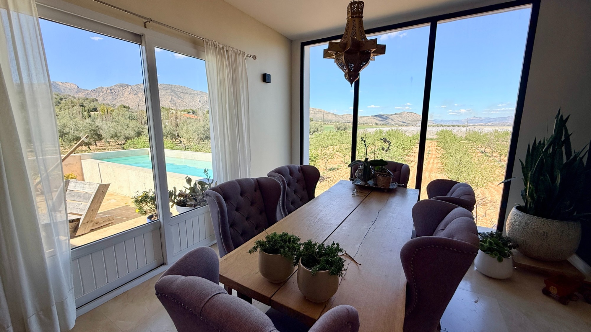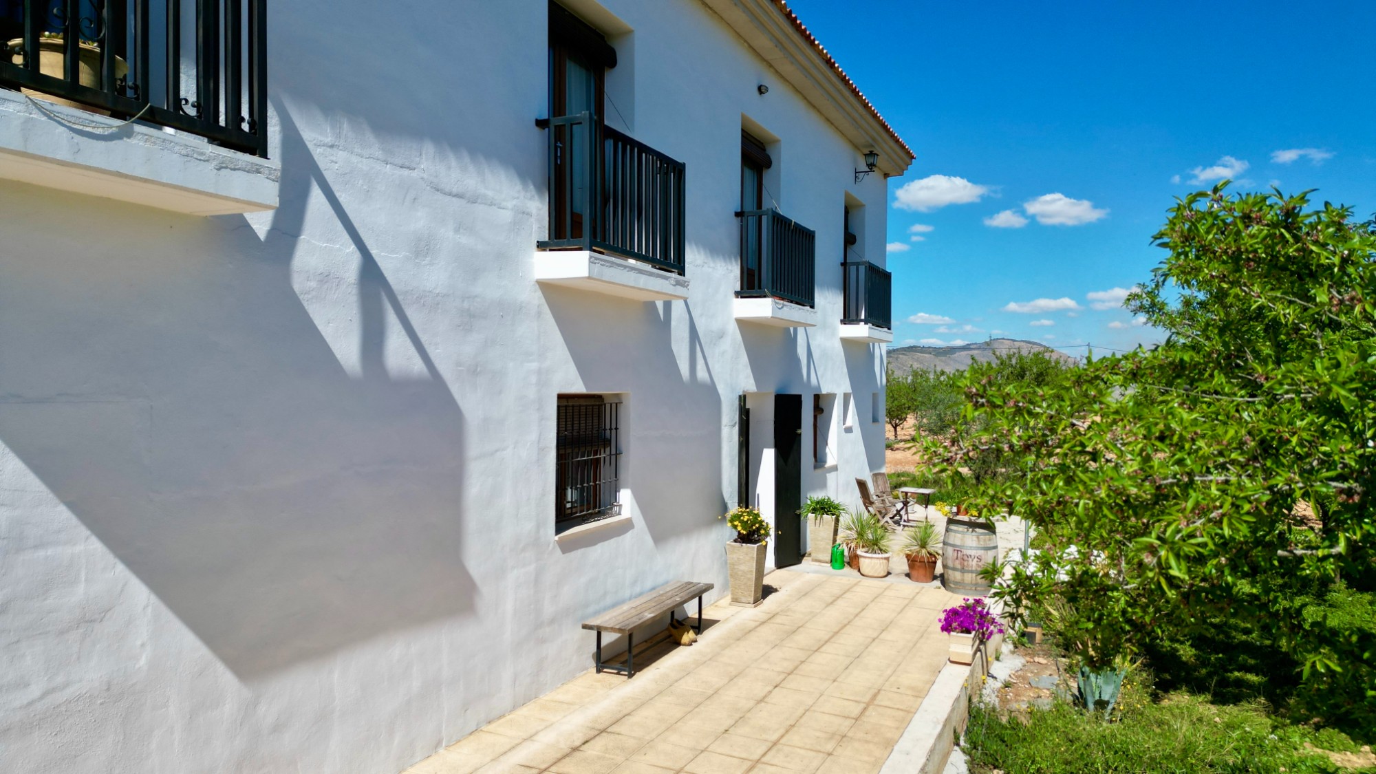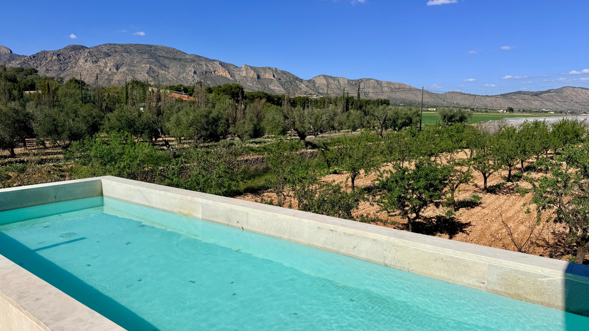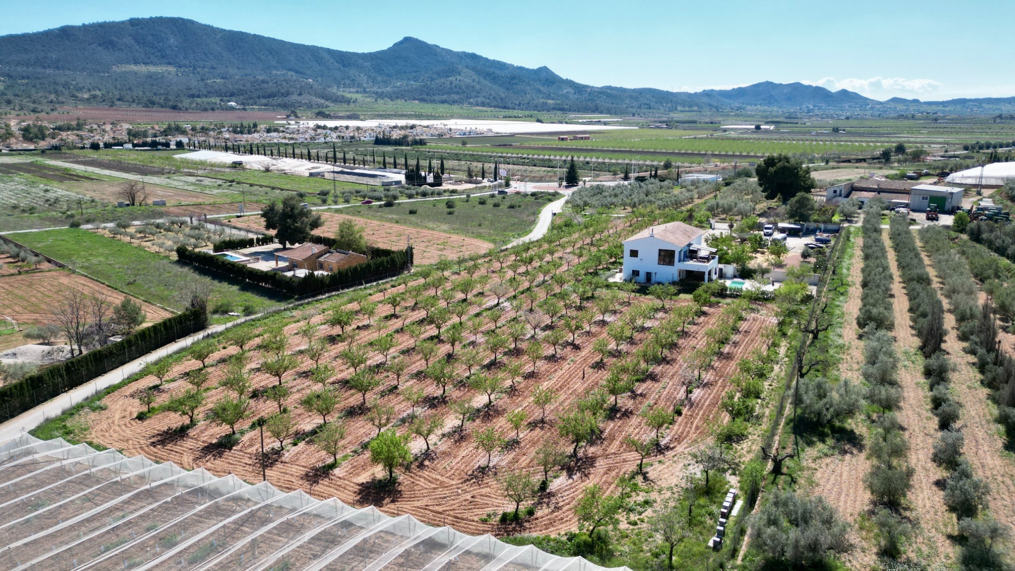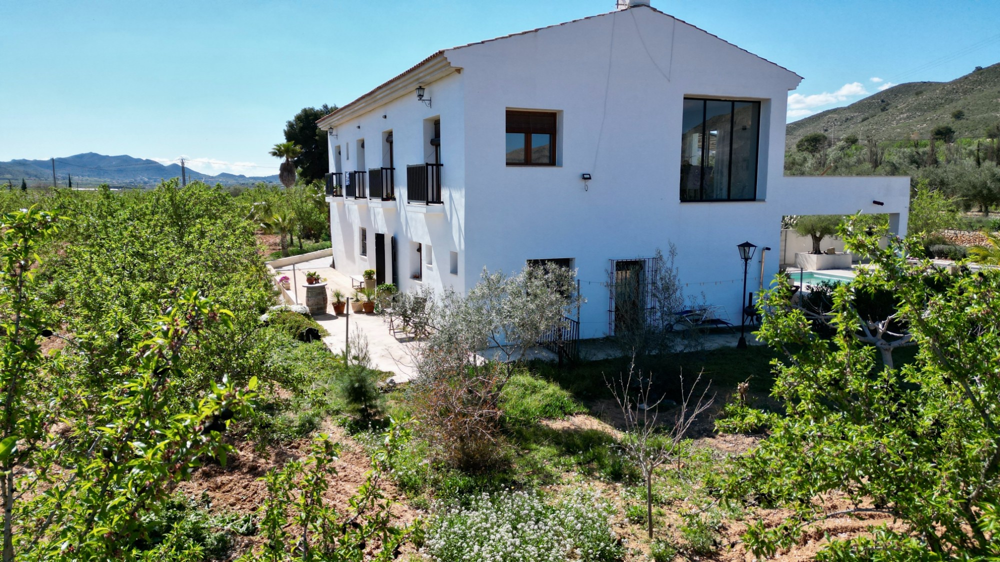 Set discreetly within its own 12,600m² private estate, surrounded by approximately 200 productive almond trees, this exceptional finca-style villa offers a rare fusion of traditional Mediterranean charm and contemporary design. Located between the charming villages of Hondón de las Nieves and Hondón de los Frailes, the property provides complete tranquillity while remaining just minutes from restaurants, cafés and local amenities. From the moment you arrive through the remote-controlled sliding entrance gate, the sense of space and exclusivity is immediately clear. A palm-lined driveway leads through the grounds towards the villa, with ample guest parking and two garages accommodating up to three vehicles. This is a property designed for those who appreciate both elegant architecture and effortless entertaining. The Main Villa – Elevated Living with Panoramic Views The principal living accommodation is located on the first floor, designed to maximise the spectacular views across your own almond grove and the surrounding Hondón Valley. Entering through the foyer, you are welcomed into a central hallway leading to a magnificent open-plan living and dining space. Large feature windows flood the room with natural light while framing the landscape beyond. The living area flows seamlessly into a bespoke designer kitchen, finished in luxurious dark tones with generous work surfaces, high-quality appliances and extensive storage – ideal for both everyday living and entertaining guests. Step outside onto the expansive first-floor terrace, where the lifestyle this home offers truly comes to life. Here you will find: • A private 5m balcony swimming pool• Outdoor dining area• BBQ and entertaining space• Sunbathing terrace with panoramic valley views Imagine cooling off in the pool while overlooking your own almond grove, or enjoying long Mediterranean evenings dining under the stars. Bedrooms Designed for Comfort and Style The main floor offers three spacious double bedrooms. The master suite provides a luxurious retreat, featuring: • Double vanity unit• Walk-in shower• Bathtub• Elegant contemporary finishes Two further double bedrooms of which one is en-suite share a beautifully designed shower room, while guests are catered for with a stylish boutique guest cloakroom. Guest Apartment and Flexible Living Spaces On the ground floor, the villa offers a fully self-contained guest apartment, ideal for visitors, extended family or independent accommodation. This area includes: • Two double bedrooms• Bathroom• Fully equipped kitchen• Lounge and dining area• Pellet burner and fireplace In addition, the lower level also includes: • A beauty studio with bathroom (easily converted into an additional guest suite)• Storage areas and utility rooms• A shaded outdoor dining and bar area• Access to the main pool terrace With these flexible spaces, the property could potentially offer up to seven bedrooms, or alternatively provide space for: • A private office• Gym or wellness studio• Art or music studio• Hobby room Outdoor Living – Designed for Entertaining The exterior of the property is equally impressive and designed around outdoor living. The main swimming pool area is the focal point for entertaining, featuring: • A 9-metre swimming pool with beach-style entry• Large sunbathing terrace• Shaded dining and BBQ areas• Outdoor bar area perfect for summer gatherings With over 300 days of sunshine per year, the Hondón Valley offers the perfect setting for enjoying this exceptional outdoor lifestyle. Private Estate Living The villa sits on a 12,600m² plot, with approximately 12,000m² securely fenced. The almond grove can be easily maintained by a local farmer if desired, allowing you to enjoy the beauty of the land without the responsibility of managing it yourself. During spring, when the almond trees blossom, the landscape transforms into a spectacular display of colour – a truly special experience. Modern Comforts Despite its traditional finca-inspired architecture, the villa offers modern comfort throughout, including: • Mains drinking water• Irrigation water supply• Mains electricity and gas• Underfloor heating• Fast and reliable internet• Modern sewage system The property is being sold unfurnished, although selected furniture may be available via separate negotiation. Location The villa enjoys a privileged position in the heart of the Hondón Valley, one of the most desirable inland areas of Alicante. Within five minutes, you will find more than 25 bars, restaurants and cafés, while Alicante airport and the Mediterranean coast are just over 30 minutes away. This exceptional property offers the rare combination of privacy, space, design and accessibility, making it an ideal permanent residence or luxury countryside retreat. Viewings are strictly by appointment only. If you would like to experience this unique villa in person, please contact us directly for further information.