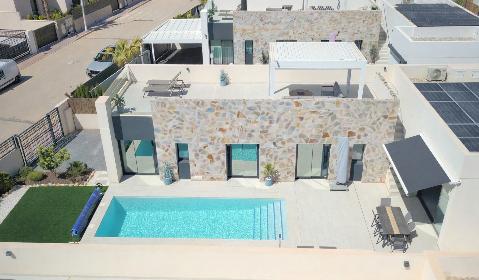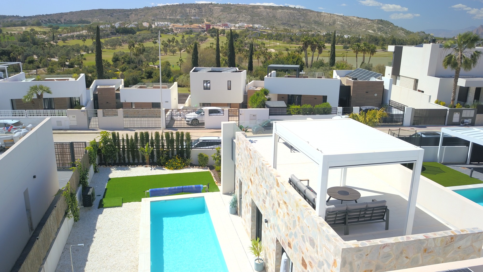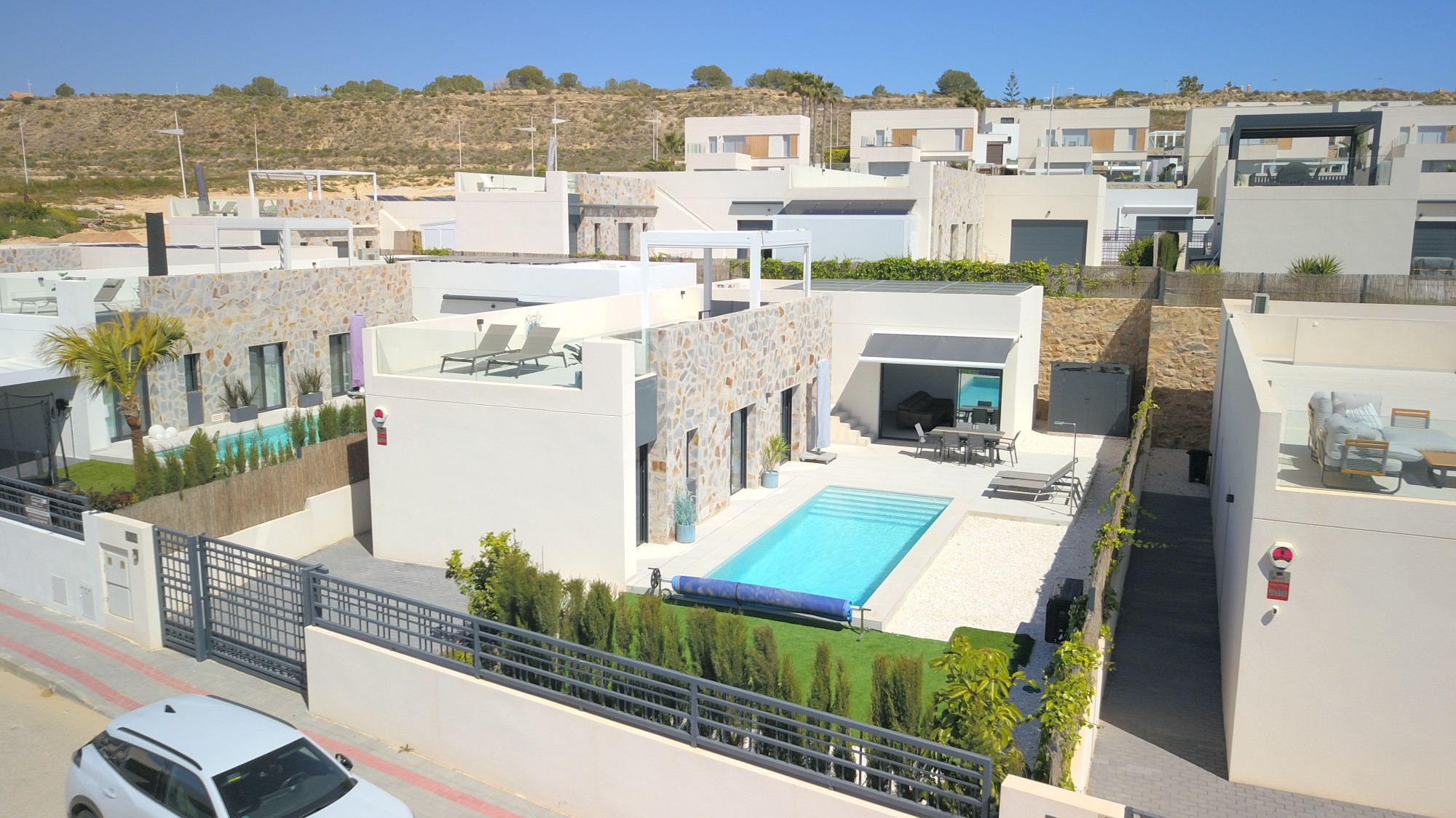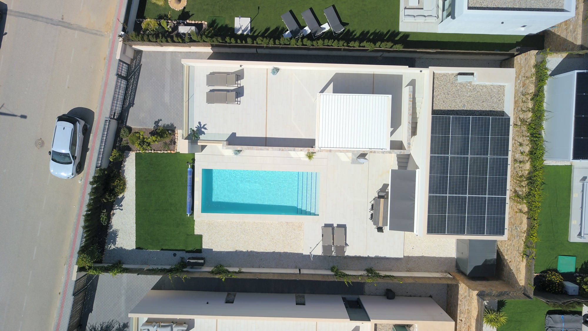 Cette villa individuelle de trois chambres, orientée ouest, est située dans le complexe hôtelier et spa 5 étoiles La Finca Golf, un emplacement prestigieux sur la Costa Blanca Sud, à seulement 10 minutes à pied des cafés, restaurants et boutiques. La ville d'Algorfa est à 5 minutes en voiture, tandis que Quesada et Benijófar, offrant davantage de commodités, sont accessibles en 10 minutes. Les magnifiques plages de la côte sont à seulement 20 minutes. Cette maison moderne et impeccable de 118 m² est implantée sur un terrain de 380 m² et a été construite fin 2024 par l'un des constructeurs les plus réputés de la région. Elle offre un style de vie élégant et de plain-pied. Le vaste séjour ouvert est doté d'un panneau mural infrarouge et de larges baies vitrées coulissantes avec store électrique, donnant sur la terrasse et la piscine. La cuisine contemporaine équipée comprend un bar et une buanderie complète ce bien. Cette maison comprend trois chambres doubles, toutes dotées de placards intégrés et d'un accès direct au jardin. La chambre principale bénéficie d'une salle de douche attenante, et une deuxième salle de douche familiale est également disponible. Les deux salles de douche sont équipées d'un chauffage au sol. À l'extérieur, un solarium privé offre une vue imprenable sur la campagne et le golf. Il est agrémenté d'une pergola électrique bioclimatique avec stores sur trois côtés. Le jardin, magnifiquement entretenu, est agrémenté de gazon synthétique, de massifs de galets et d'une piscine privée chauffée de 9 x 3 mètres (avec Wi-Fi). Parmi les autres atouts, citons un portail électrique pour l'accès en voiture, des panneaux solaires raccordés au réseau et une climatisation gainable Airzone, faisant de cette propriété un bien d'exception.