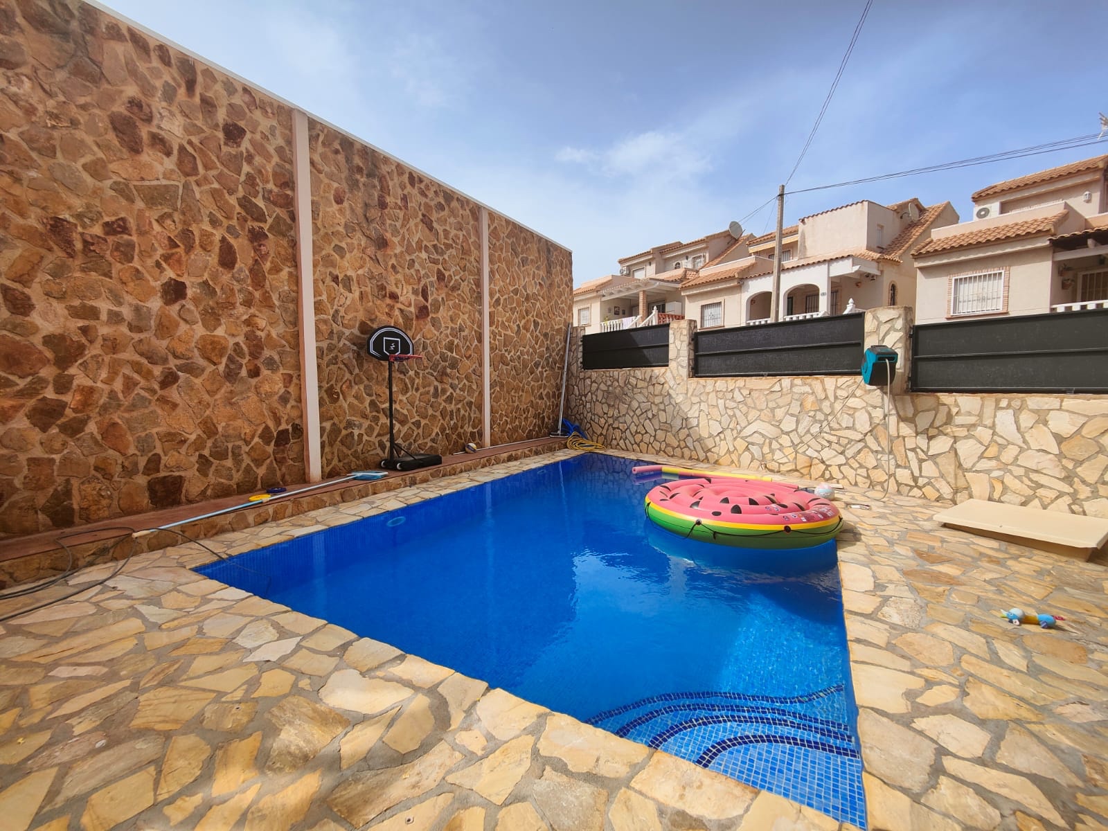 Vous entrez par un portail automatique longeant le jardin carrelé. L'allée vous mène à un grand garage souterrain, qui dispose également d'un placard complet et d'une salle de bains séparée. Le rez-de-chaussée dispose d'une terrasse donnant sur le salon et la salle à manger, d'une cuisine séparée avec tous les appareils électroménagers et d'un débarras adjacent à la cuisine. Au premier étage, il y a 3 chambres et 2 salles de bains, dont 1 ensuite. Une piscine privée (6x4m), panneaux solaires, vidéophone et chauffage central au gaz. La maison est conçue comme résidence permanente, tout est fini avec de très bons matériaux et est très bien entretenu par les propriétaires actuels.