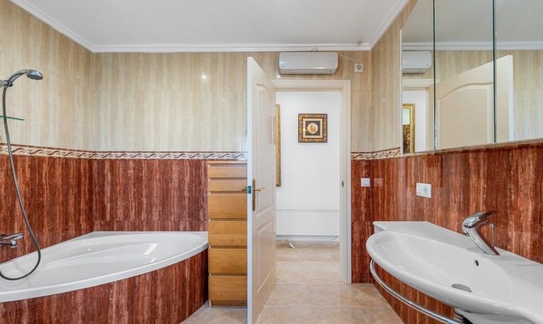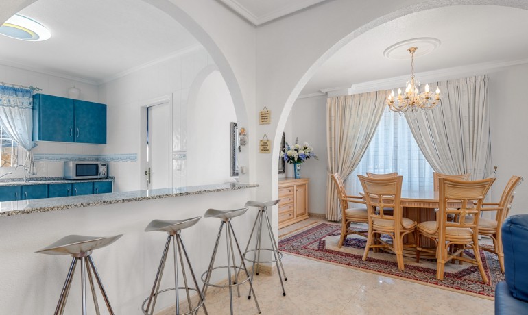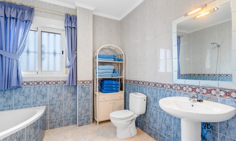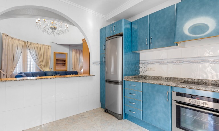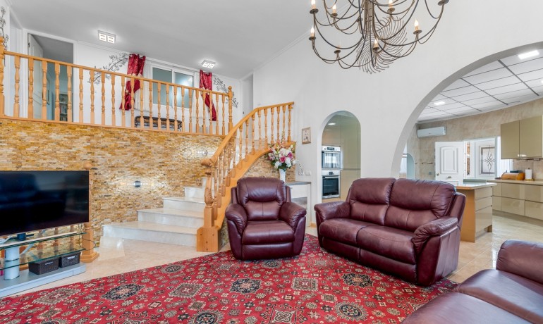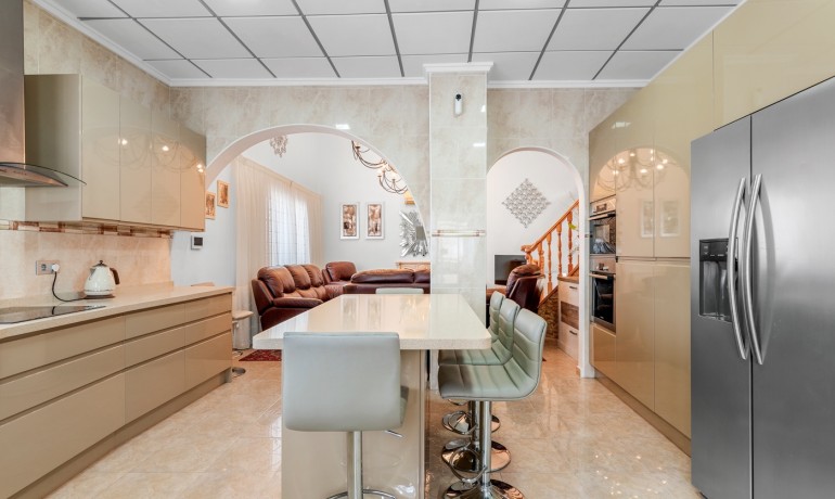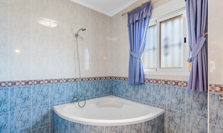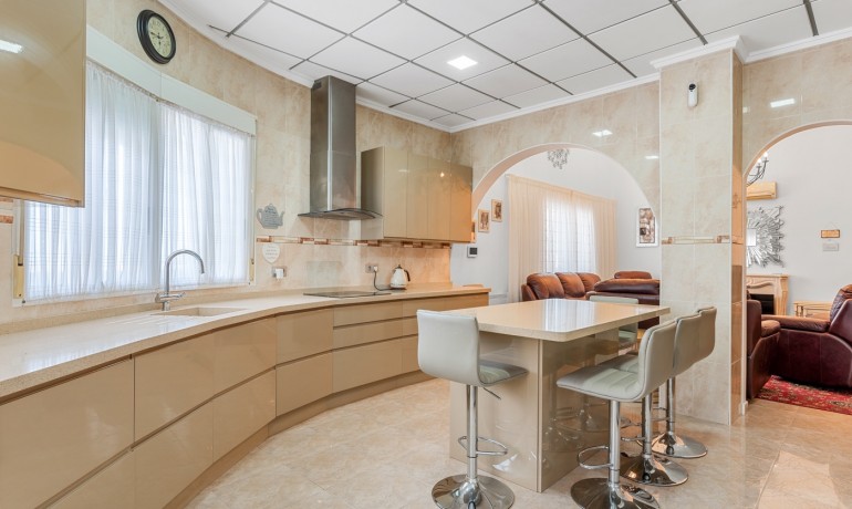 Deze ruime en goed ontworpen villa biedt privacy, flexibele woonmogelijkheden en royale buitenruimtes in een van de rustigste woonwijken van Ciudad Quesada. Gelegen aan het einde van een rustige eenrichtingsstraat, biedt het pand een kalme omgeving met minimale verkeersdrukte, terwijl het toch dicht bij winkels, restaurants en dagelijkse voorzieningen ligt. Het huis staat op een perceel van 1.000 m² en heeft 179 m² aan bebouwde oppervlakte verdeeld over drie niveaus. De hoofdwoning beslaat de eerste twee verdiepingen. Op de begane grond bevindt zich een lichte woonkamer, een volledig uitgeruste keuken, een wasruimte en een slaapkamer met en-suite badkamer. Hoewel deze slaapkamer geen directe toegang tot buiten heeft, zijn de belangrijkste leefruimtes naadloos verbonden met de terrassen en het privézwembad, wat zorgt voor een ontspannen en functionele indeling. Op de tweede verdieping bevinden zich drie slaapkamers en twee badkamers. Eén van de slaapkamers is een suite, met een eigen badkamer en een inloopkast. Een centrale overloop verbindt de kamers en laat licht door het open ontwerp van het huis. De bovenste verdieping functioneert als een semi-onafhankelijke gastenverblijf binnen hetzelfde gebouw. Het bevat drie slaapkamers, twee badkamers, een keuken, woon- en eetgedeelte, een wasruimte en een overdekt terras — ideaal voor uitgebreide familie, langdurige gasten of privégebruik. De buitenruimtes zijn ontworpen voor comfort en ontspanning, met een privézwembad, meerdere terrassen en een zithoek onder een pergola. Het pand beschikt ook over een privégarage en een aparte berging. Extra kenmerken zijn airconditioning, ingebouwde kasten en een oostelijke oriëntatie die de ochtendzon opvangt. Met in totaal zeven slaapkamers en zes badkamers is deze villa een veelzijdige en uitnodigende woning, geschikt voor gezinnen, meergeneratiewonen of wie op zoek is naar een ruime woning in een rustige maar goed verbonden omgeving.