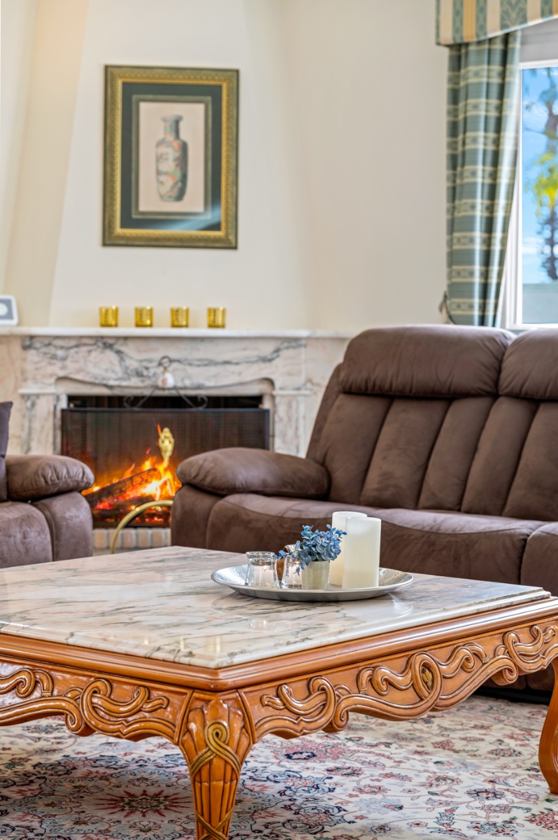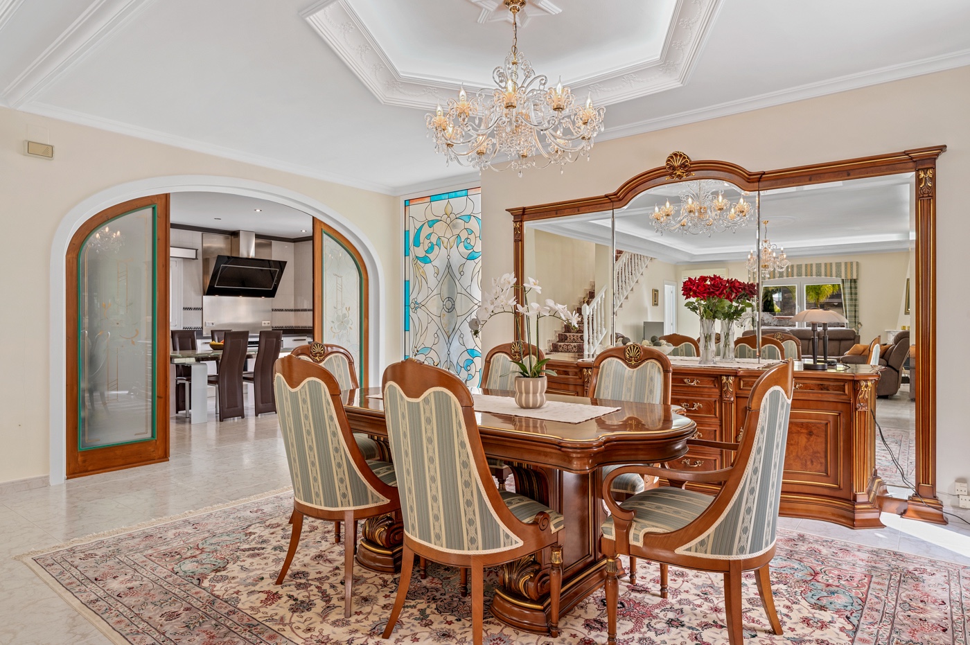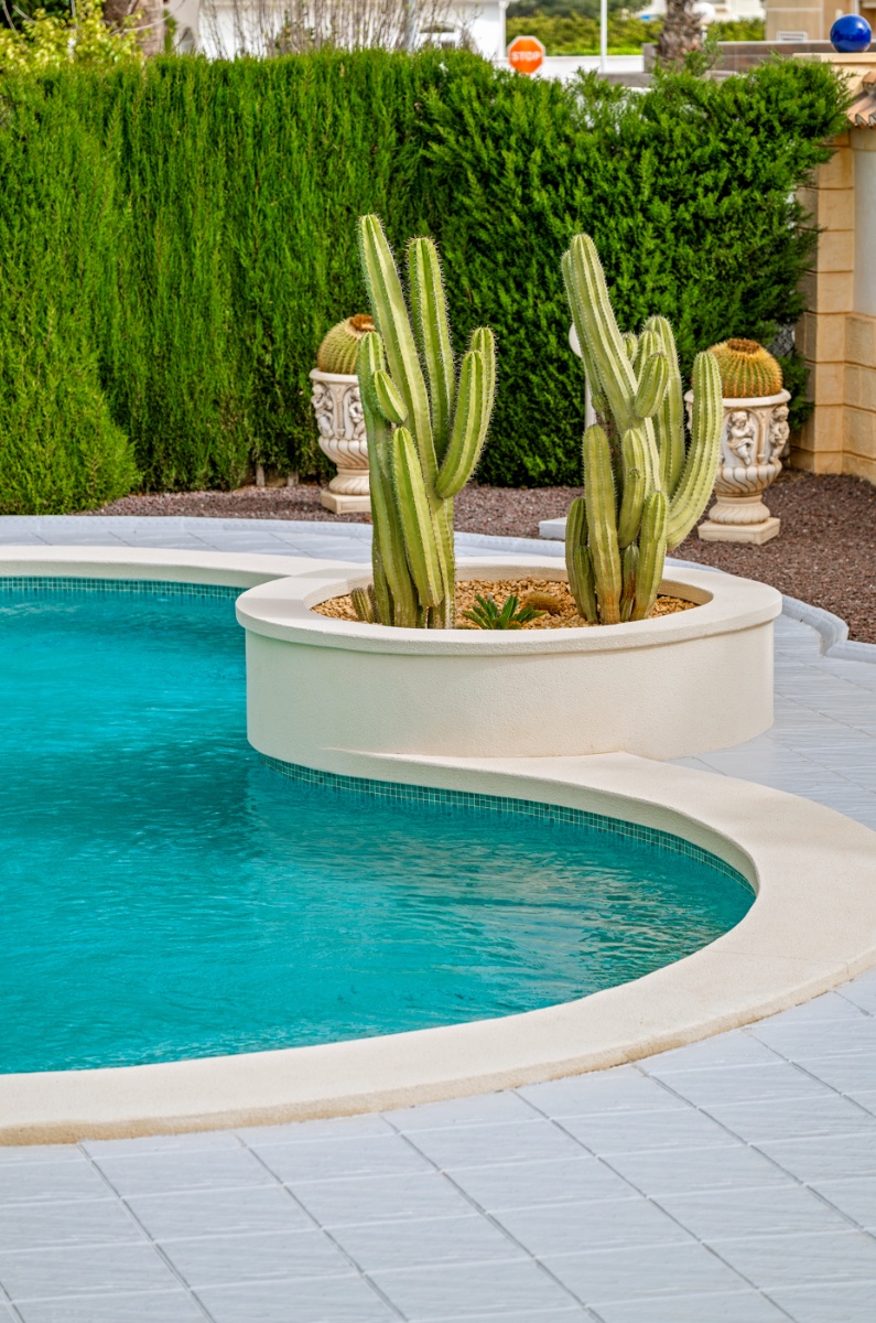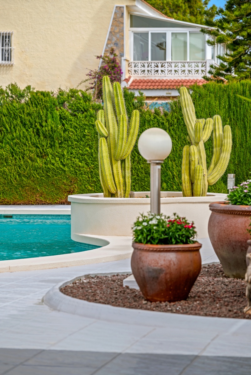 Grote luxe villa met 4 slaapkamers in Ciudad Quesada. De villa is verdeeld over 3 niveaus en heeft in totaal vier slaapkamers en zes badkamers. Op de begane grond vindt u één slaapkamer, één badkamer, een ruime woon- en eetkamer, een keuken met extra eetruimte en een glazen terras dat als extra woonkamer dient. In de woonkamer bevindt zich een mooie open haard. Vanuit de keuken en het glazen terras heeft u directe toegang tot de tuin. Op de eerste verdieping bevinden zich twee slaapkamers en twee badkamers, waarvan één en-suite bij de hoofdslaapkamer. Vanuit de slaapkamers heeft u toegang tot een terras met uitzicht op het zwembad. Op de benedenverdieping bevindt zich een grote open ruimte die wordt gebruikt als woonkamer. Hier vindt u ook een slaapkamer en twee badkamers (doucheruimtes zonder toilet), waarvan één en-suite. De villa is uitgerust met airconditioning, elektrische rolluiken, dubbele beglazing en een alarmsysteem. BuitenruimteDe villa staat op een perceel van 1.058 m². Hier vindt u een groot zwembad (125 m²) dat onlangs is gerenoveerd en veel ruimte rondom het zwembad voor zitgedeeltes. Daarnaast is er een complete buitenbadkamer, een garage met een bijkeuken, extra parkeergelegenheid op het perceel en een grote houten berging. Zowel de garagedeur als de toegangspoort voor de parkeerplaats zijn automatisch. De prachtige tuin is mooi aangelegd en gemakkelijk te onderhouden. De villa ligt op korte loopafstand van diverse restaurants en cafés.