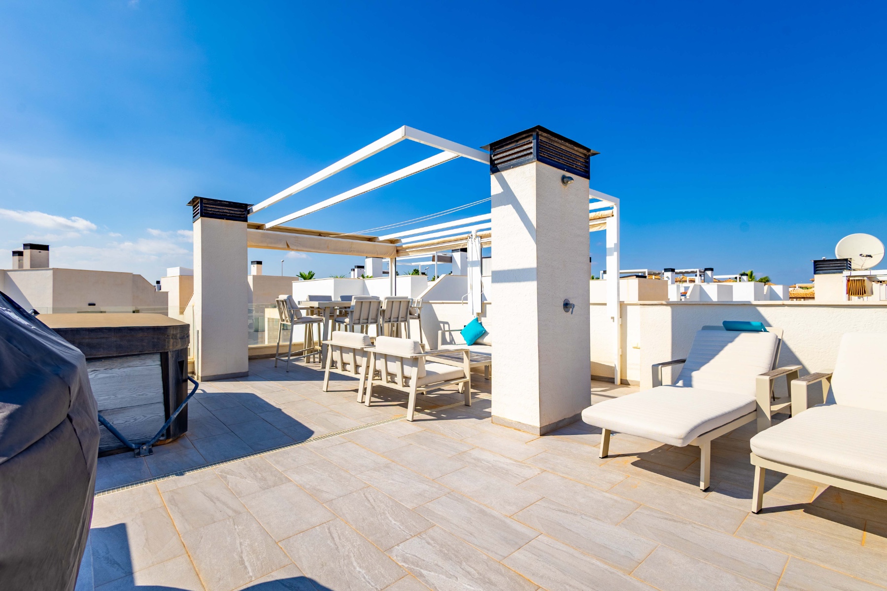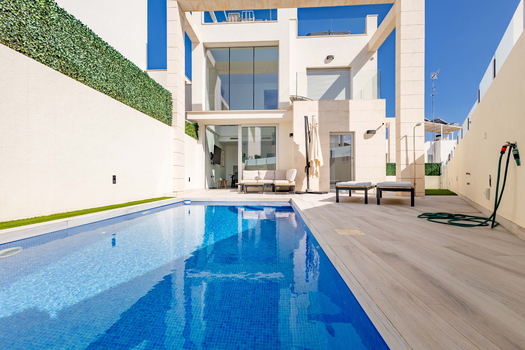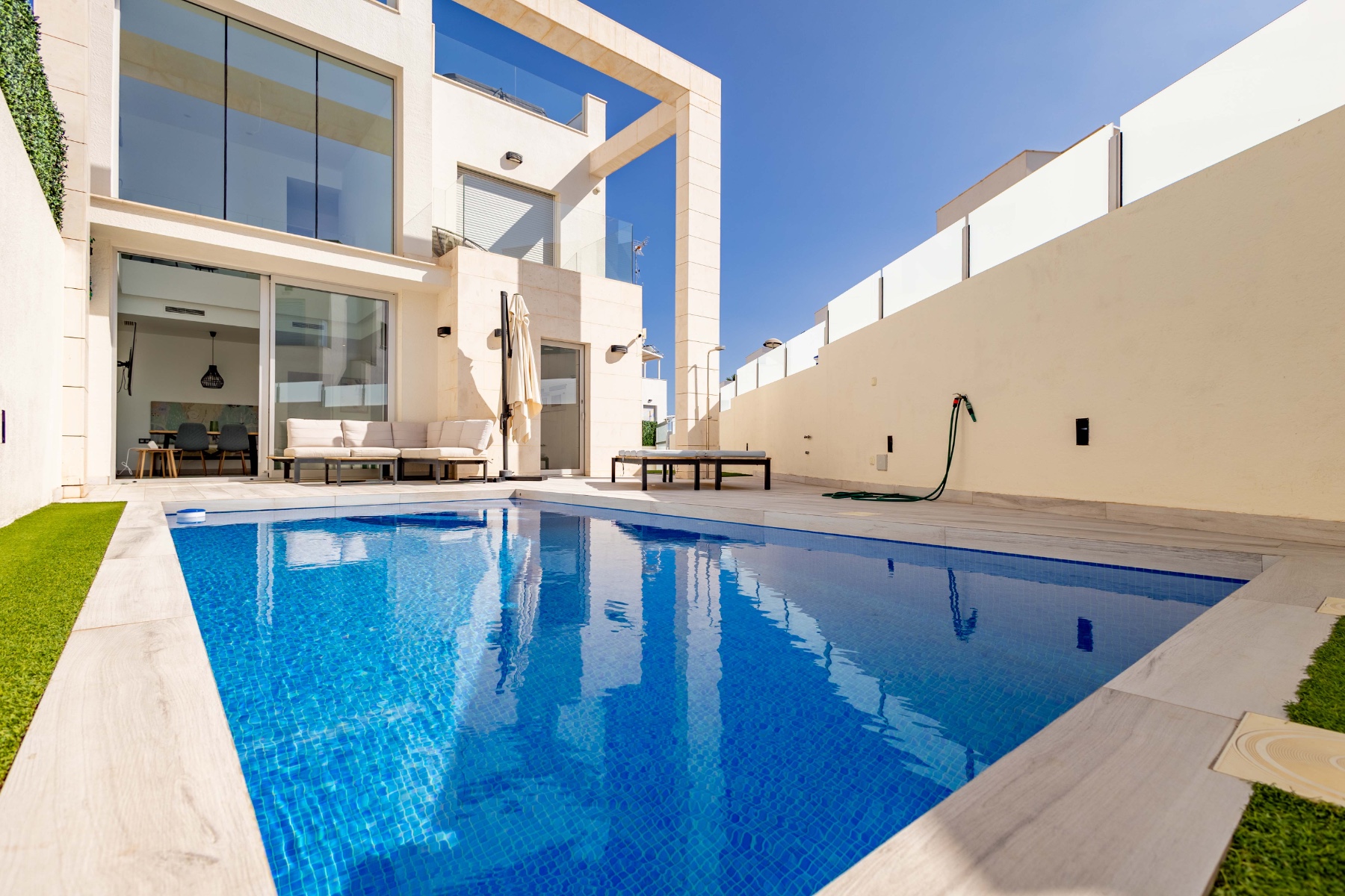 Moderne villa te koop in Lomas de Cabo Roig – Orihuela Costa (Zuid-Costa Blanca) Elegantie, comfort en een toplocatie : deze indrukwekkende villa in moderne stijl ligt in een van de meest exclusieve gebieden van de zuidelijke Costa Blanca: Lomas de Cabo Roig, in Orihuela Costa. Met een bebouwde oppervlakte van 217 m² biedt deze tweedehands woning in uitstekende staat 3 slaapkamers , 3 badkamers en is gelegen op een privéperceel van circa 260 m² . Geniet van een privézwembad , een solarium met uitzicht op zee en een ongelooflijk ruime kelder van 85 m² , perfect voor een recreatieruimte, fitnessruimte, extra slaapkamers of zelfs een gastenverblijf. Groot dakterras, parkeergelegenheid op eigen terrein en privé zwembad. De villa is gebouwd met hoogwaardige materialen en beschikt over een moderne en functionele afwerking. Hij wordt volledig uitgerust verkocht, inclusief airconditioning . Toplocatie: Omringd door prestigieuze golfbanen, stranden met een Blauwe Vlag , uitgaansgelegenheden en restaurants waar u kunt genieten van de mediterrane levensstijl. Op slechts een paar minuten afstand ligt het populaire winkelcentrum Zenia Boulevard , een van de grootste openluchtwinkelcentra van Europa. Uitstekende vervoersverbindingen: op slechts 40 minuten van de luchthaven van Alicante en vlakbij het hogesnelheidstreinstation, waardoor deze villa ideaal is als permanente woning, vakantiehuis of investering. Wilt u meer informatie of een bezichtiging inplannen? Neem vandaag nog contact met ons op en ontdek uw volgende woning aan de Costa Blanca.