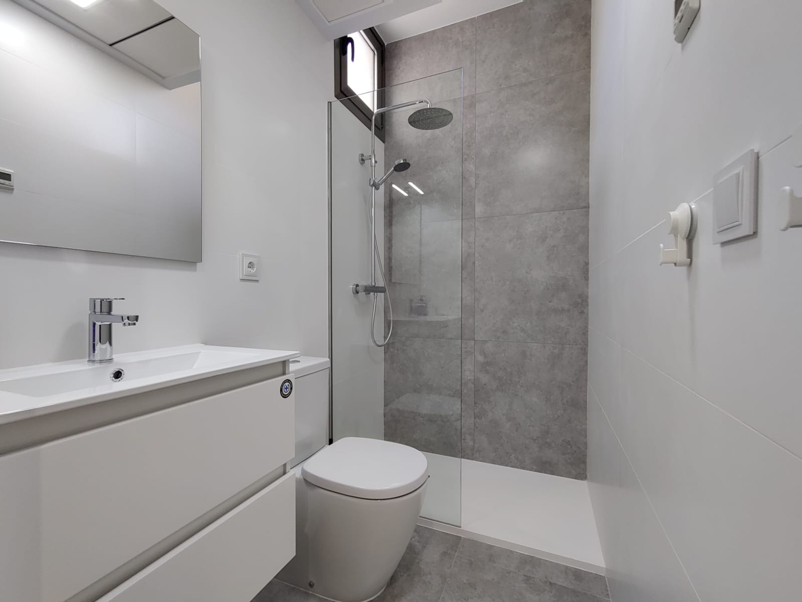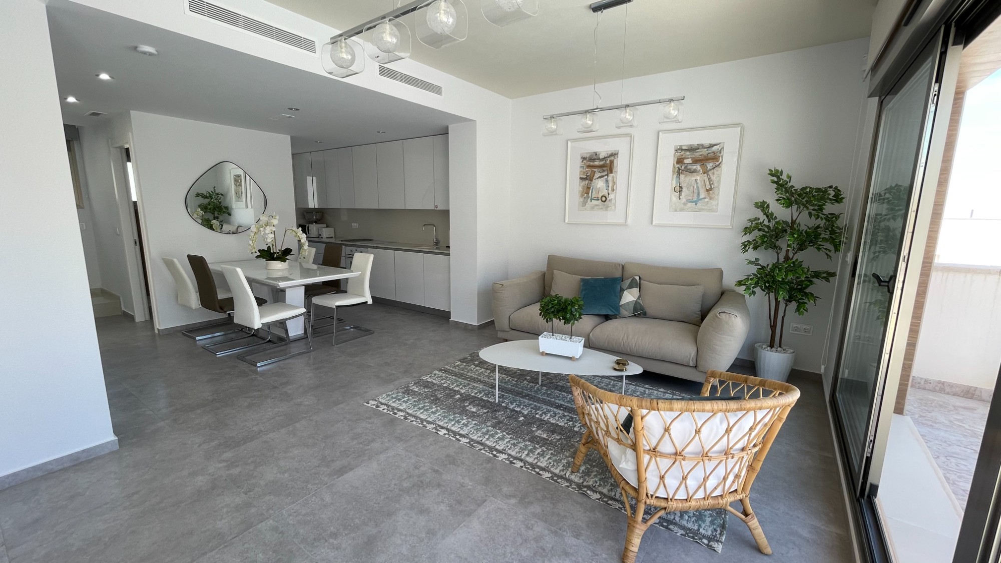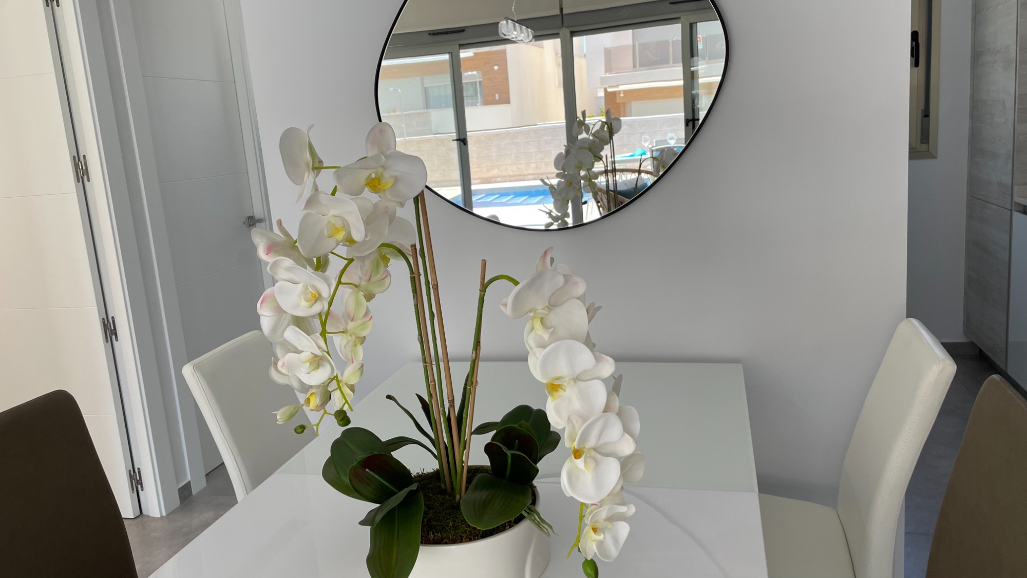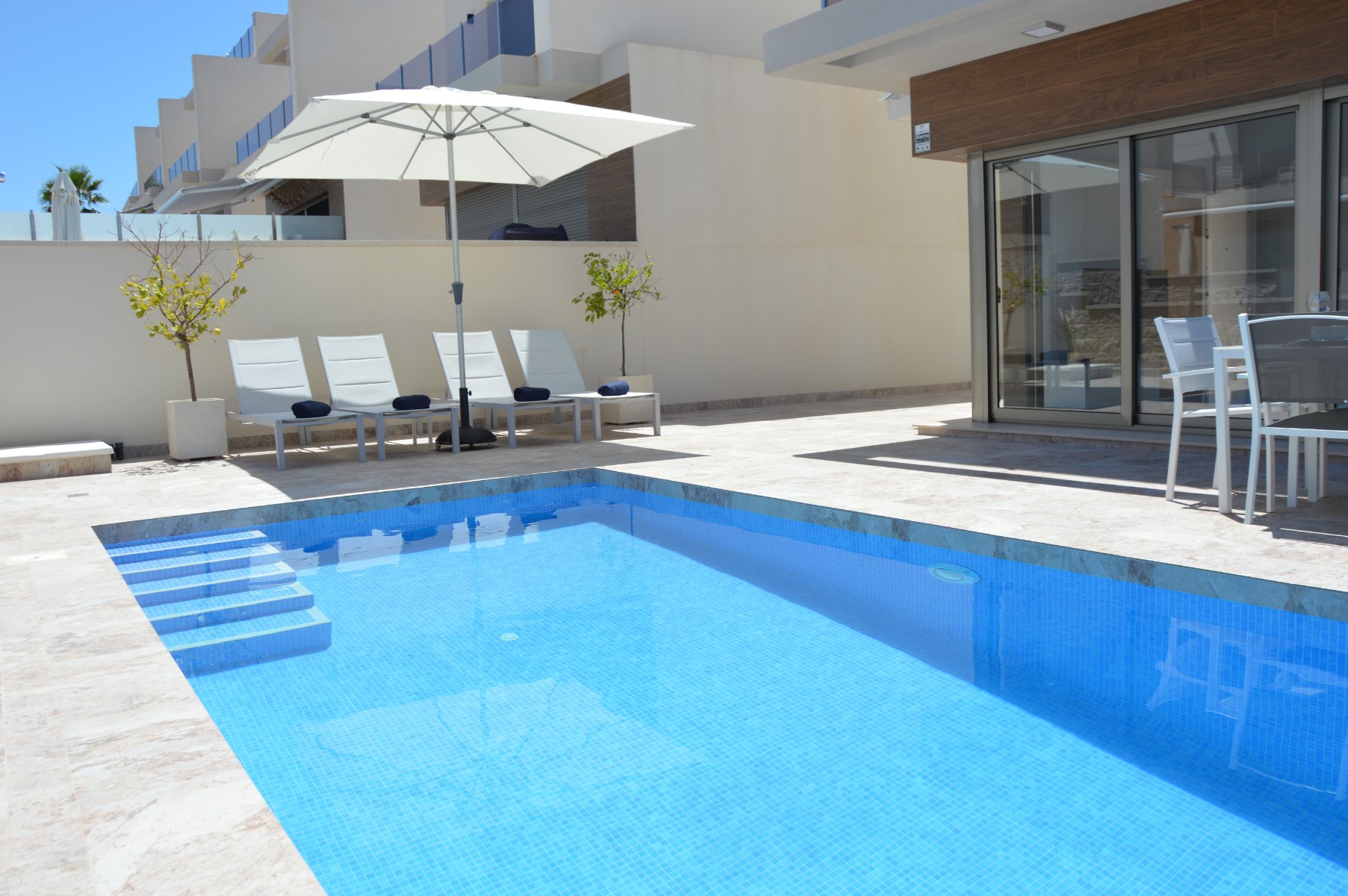 Deze stijlvolle villa met 3 slaapkamers en 3 badkamers biedt comfort, privacy en hoogwaardige afwerking. Eén slaapkamer en badkamer bevinden zich op de begane grond, wat deze woning geschikt maakt voor zowel permanente bewoning als verblijf met gasten van alle leeftijden. De lichte woonkamer loopt naadloos over in de open keuken, die volledig is ingericht met onder meer een vaatwasser, oven, magnetron, koel-vriescombinatie en Nespresso-apparaat. Dankzij de grote schuifpui verbindt de woonkamer het binnenleven met de tuin. Hier geniet u van uw eigen omheinde buitenruimte met privézwembad, buitendouche, ligbedden en een gezellige zithoek. Op eigen terrein is parkeergelegenheid achter een afgesloten poort. Op de eerste verdieping bevinden zich twee ruime slaapkamers, elk met een eigen badkamer en toegang tot een zonnig balkon. Via deze verdieping bereikt u het ruime privésolarium. Vanaf hier heeft u een prachtig 360° uitzicht over de natuurlijke omgeving en de zoutmeren van Torrevieja – een ideale plek voor ontspanning, zonmomenten en avonden in de buitenlucht. De woning is uitgerust met airconditioning (warm/koud), ingebouwde kasten, wasmachine en een modern interieur. Het geheel wordt in uitstekende staat aangeboden, volledig gemeubileerd, inclusief volledige inventaris. Als klap op de vuurpijl beschikt de woning over een grote, open onderbouw welke is afgewerkt zoals de rest van de woning met tegelvloer, netjes gestucte muren en natuurlijk daglicht. Deze omgeving combineert rust en ruimte met een brede keuze aan golfbanen, stranden, winkels en horeca. Perfect voor wie het hele jaar door wil genieten van het mediterrane leven. Of u nu een tweede woning, permanente woonplek of verhuurinvestering zoekt, deze villa biedt een waardevaste en aantrekkelijke kans in één van de meest gewilde gebieden van Orihuela Costa. Neem contact met ons op voor meer informatie!